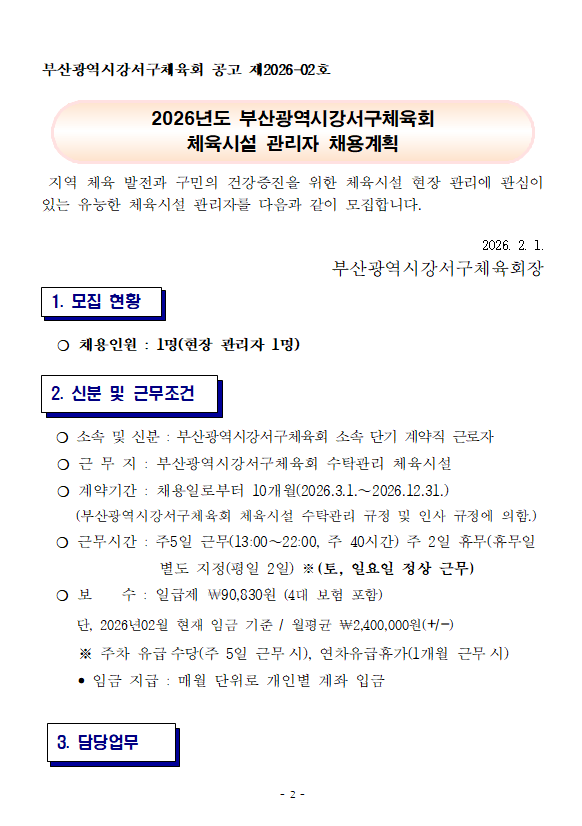 2026년 부산광역시강서구체육회 체육시설 관리자 채용공고