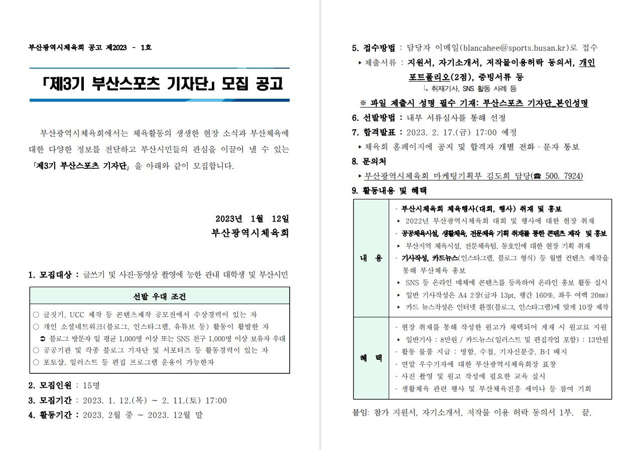 「제3기 부산 스포츠 기자단」을 모집하고 있습니다.
