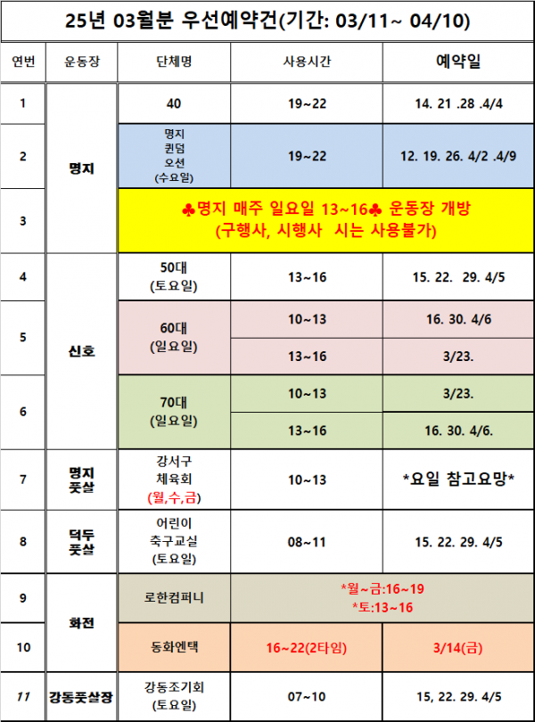 25년 03월 운동장별 우선예약 안내
