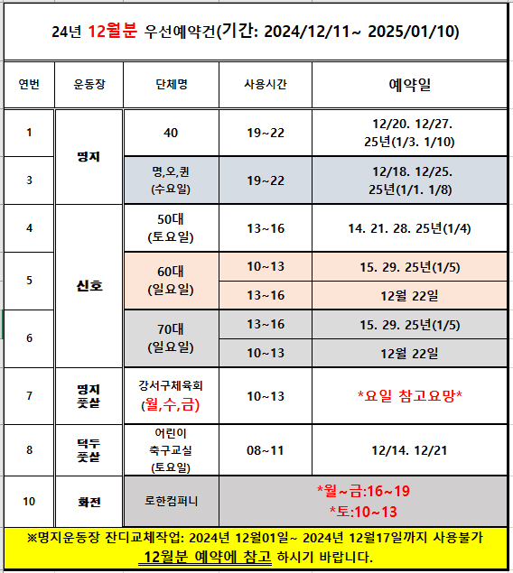 24년12/11~ 25년 01/10 우선예약 일정표